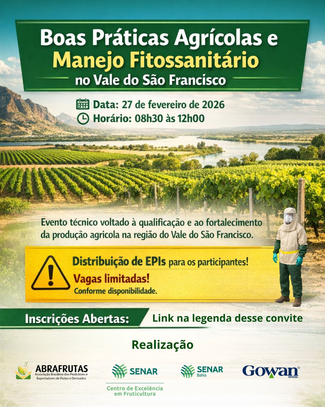 Além da Abrafrutas, com um dos responsáveis pela realização do evento, a iniciativa conta também com o SENAR, SENAR Bahia e Gowan Brasil, que atuam como parceiras na promoção da capacitação técnica, na difusão de boas práticas agrícolas e no fortalecimento da fruticultura do Vale do São Francisco, contribuindo para uma produção mais sustentável, segura e alinhada às exigências dos mercados.