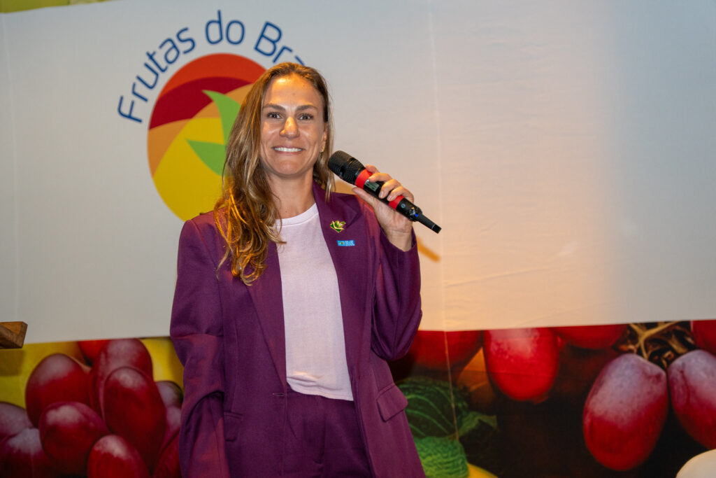 A diretora de ESG da Abrafrutas, Priscilla Nasrallah, abriu a cerimônia destacando o momento histórico que vive a fruticultura brasileira, marcada por protagonismo, inovação e responsabilidade.